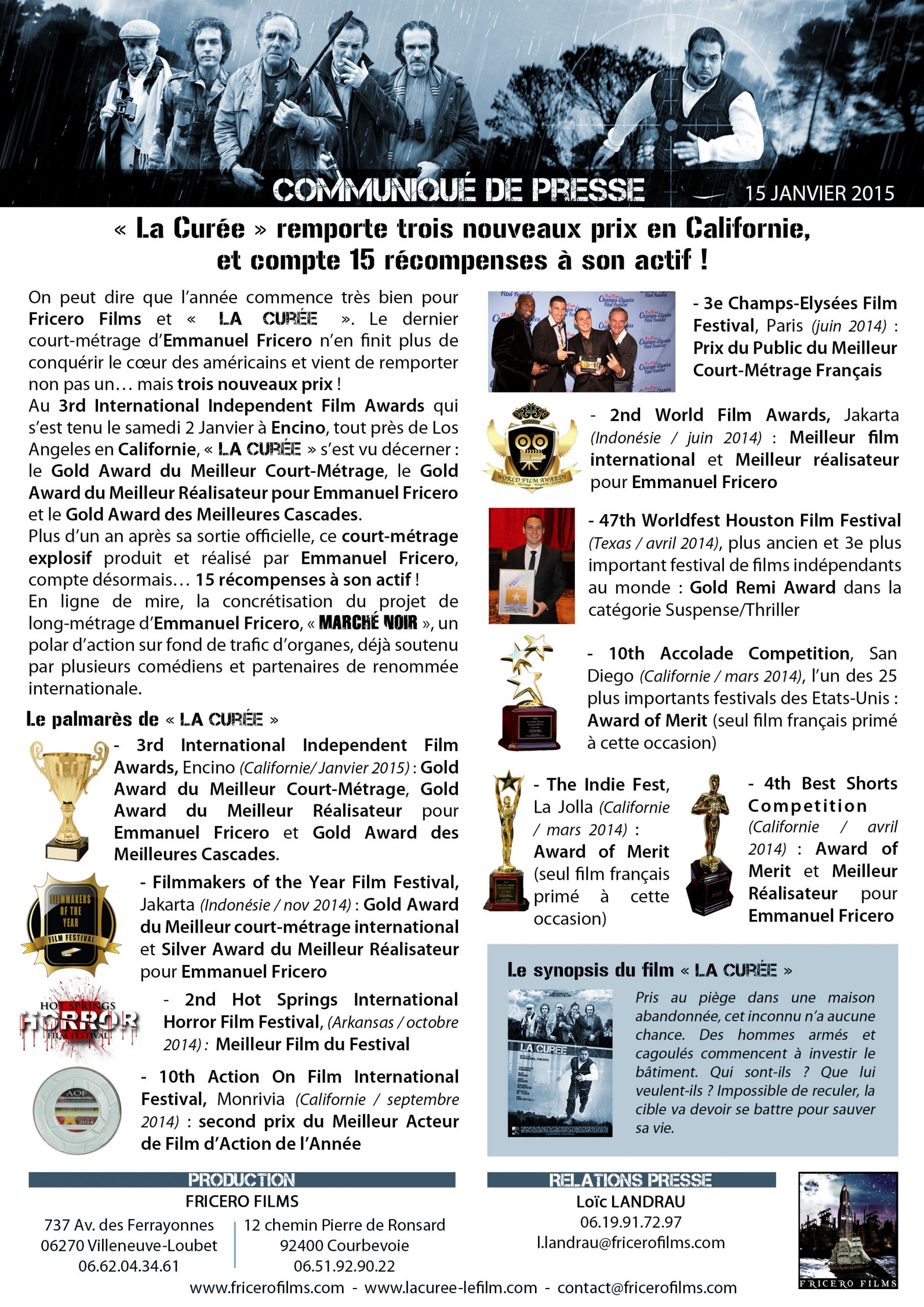 A savoir que le réalisateur-producteur, avait déjà reçu le Trophée des Chefs d’entreprises de la Ville en 2010, pour le succès de son moyen-métrage de l’époque : « La Dernière Leçon du Parrain » qui avait reçu 3 récompenses à l’international. Louis Nègre en a profité pour souligner l’évolution artistique et le talent d’Emmanuel Fricero, un cagnois en passe de réaliser son premier long-métrage cinéma !