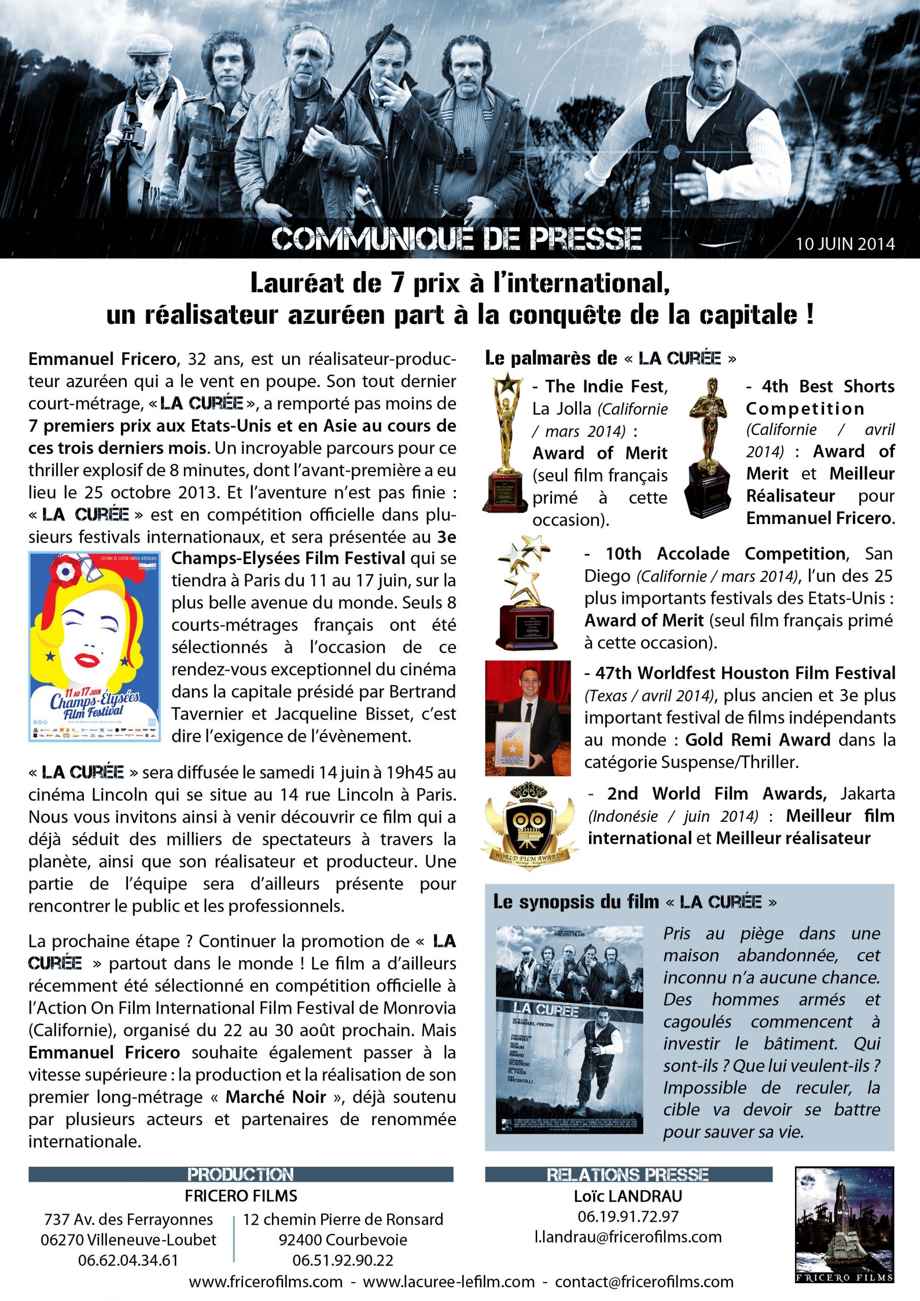 « La Curée » a reçu deux récompenses à cette occasion : Meilleur Film International et Meilleur Réalisateur. La soirée de remise de prix a eu lieu hier, au premier soir du festival. Fricero Films est évidemment heureux et fier de voir son travail reconnu jusque sur les terres d’un univers cinématographique qu’il affectionne particulièrement, et peut annoncer aujourd’hui : « La Curée » a reçu 7 prix à l’international en 3 mois !